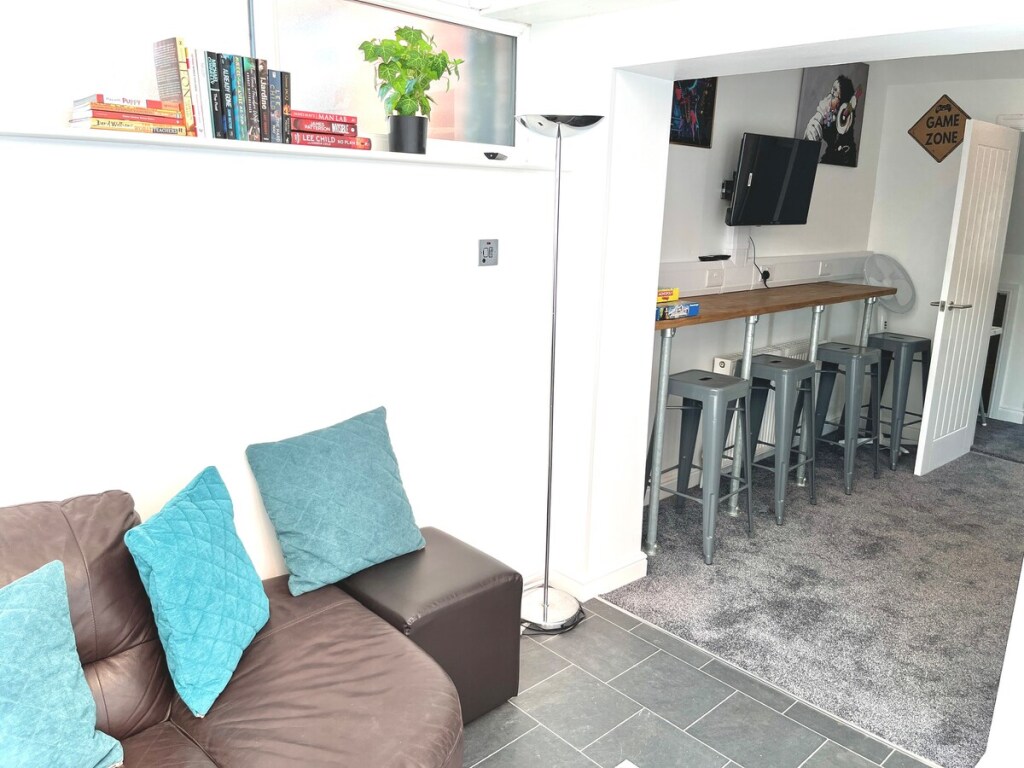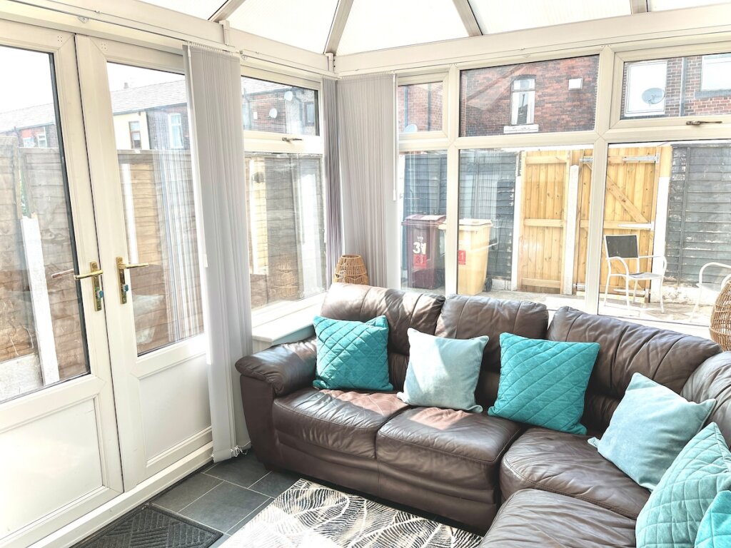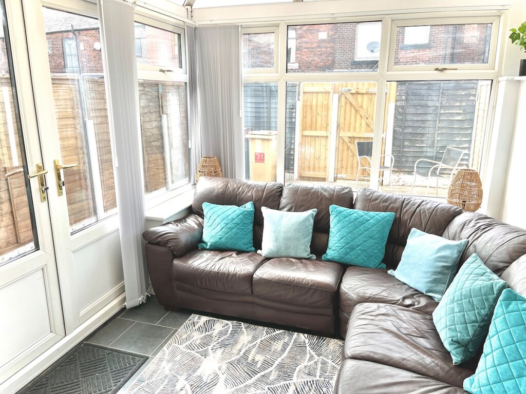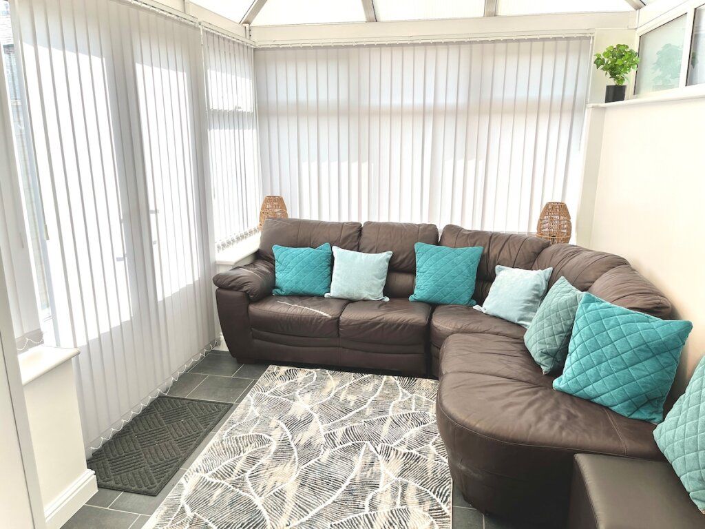 LIVING ROOM: Unwind in this bright and airy conservatory connected to the open plan kitchen / diner, featuring a large, comfy corner sofa and Smart TV, the room is filled with natural light and offers direct access to the private outdoor space. Feel free to log in to your own streaming services, just remember to log out when you leave.