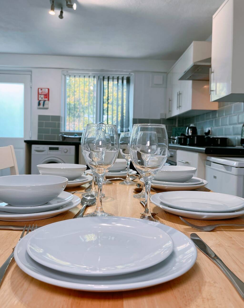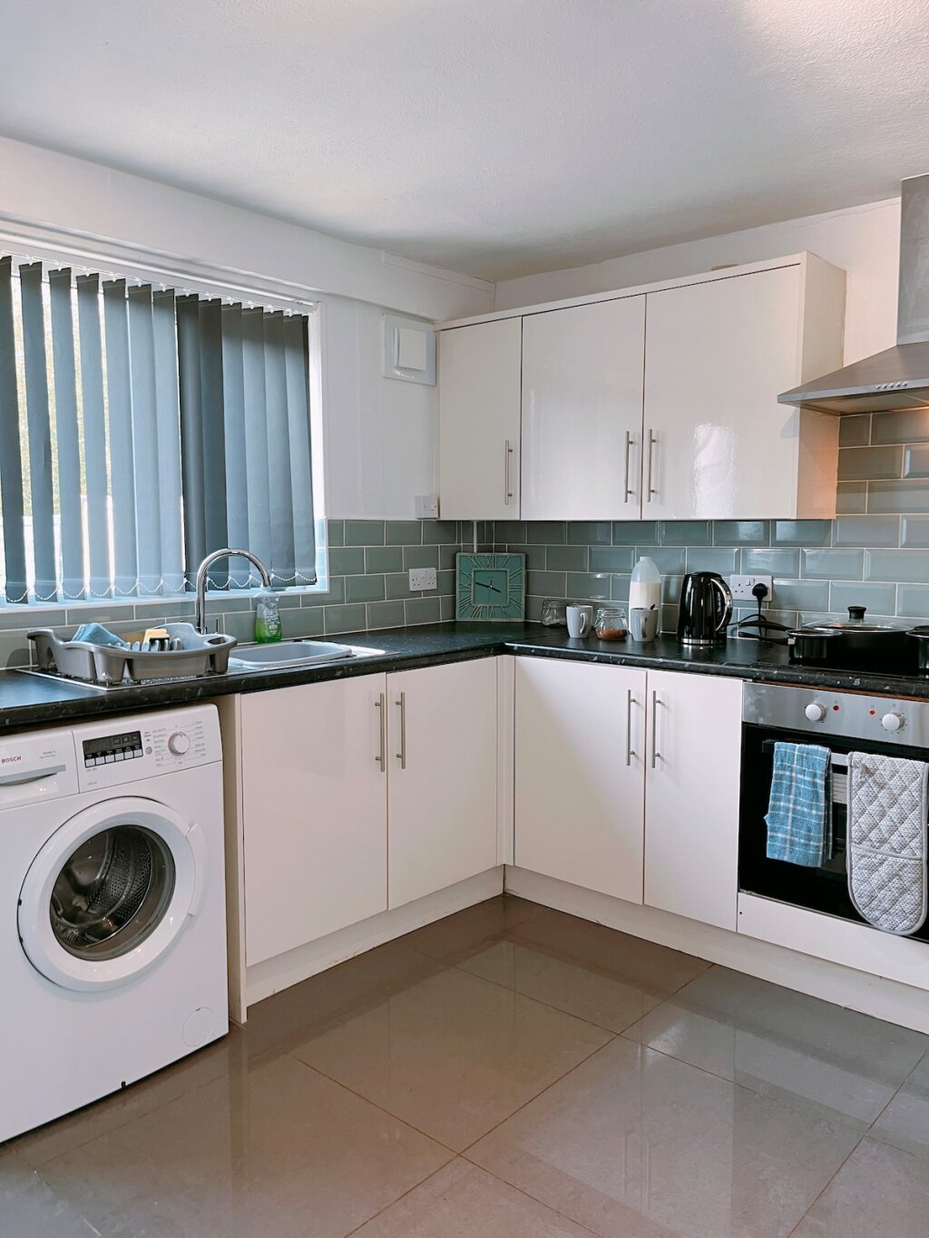 KITCHEN: Located downstairs, modern and fully equipped with everything you need during your stay. Includes, Electric hob, fan assisted oven & grill, microwave, fridge/freezer, washing machine. Also has a kettle, toaster, pots & pans, crockery, cutlery & utensils as well glasses & cups. Tea, coffee & sugar provided so you can make a brew and settle in.